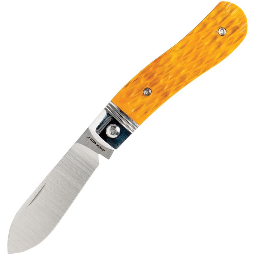 Model/Item/Part Number - JW54294. Jack Wolf Knives - K9 Satin 154CM Jack Slip Joint Knife Yellow Jigged Bone Handles. 3.75" (9.53cm) closed. 2.88" (7.32cm) satin finish 154CM stainless blade. Yellow jigged bone handle. Stainless bolster(s). Boxed. Made in China.