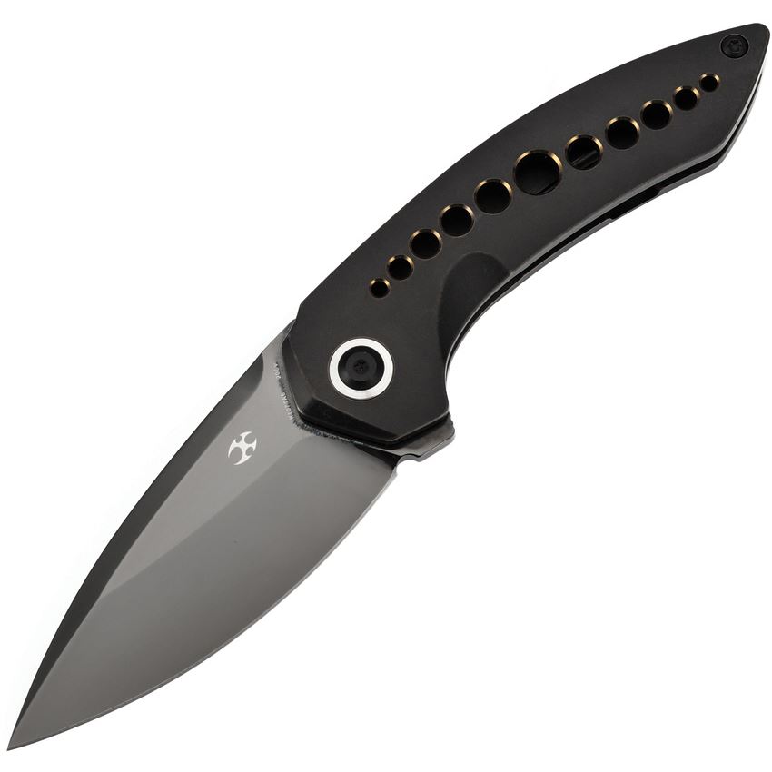 Model/Item/Part Number - K1077A6. Kansept Knives - ODD 21 Black Mirror CPM-20CV Drop Point Framelock Knife Blackwash Titanium Handles. 4.25" (10.8cm) closed. 3.13" (7.95cm) black mirror finish CPM-20CV stainless drop point blade. BlackWash finish titanium handle. Extended tang. Pocket clip. Bronze anodized machined holes in handle. Black nylon pouch. Boxed. Made in China.