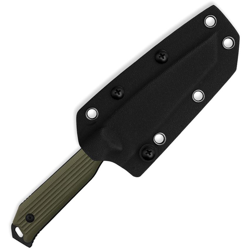 Model/Item/Part Number - KI1045MT2. Kizer Cutlery & Knives - Begleiter Black AEB-L Tanto Fixed Blade Knife Green G10 Handles. 7.88" (20.02cm) overall. 3.75" (9.53cm) black coated AEB-L stainless tanto blade. Green G10 handle. Full, extended tang. Glass breaker. Lanyard hole. Black Kydex belt sheath. Boxed. Made in China.