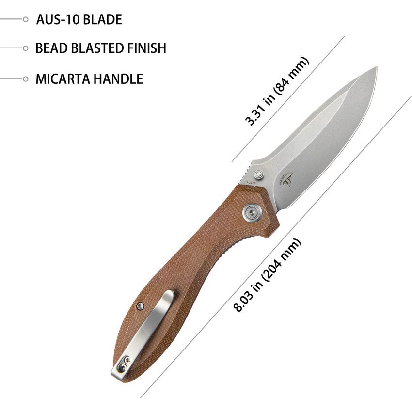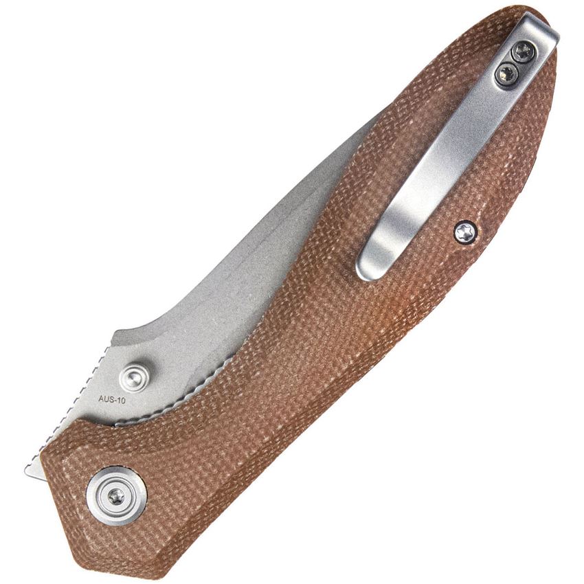 Model/Item/Part Number - KUB314M. Kubey Knives - Ruckus Stonewash Linerlock Knife Tan Canvas Micarta Handles. 4.75" (12.07cm) closed. 3.5" (8.89cm) stonewash finish AUS-10A stainless blade. Tan canvas micarta handle. Thumb stud. Extended tang. Pocket clip. Boxed. Made in China.