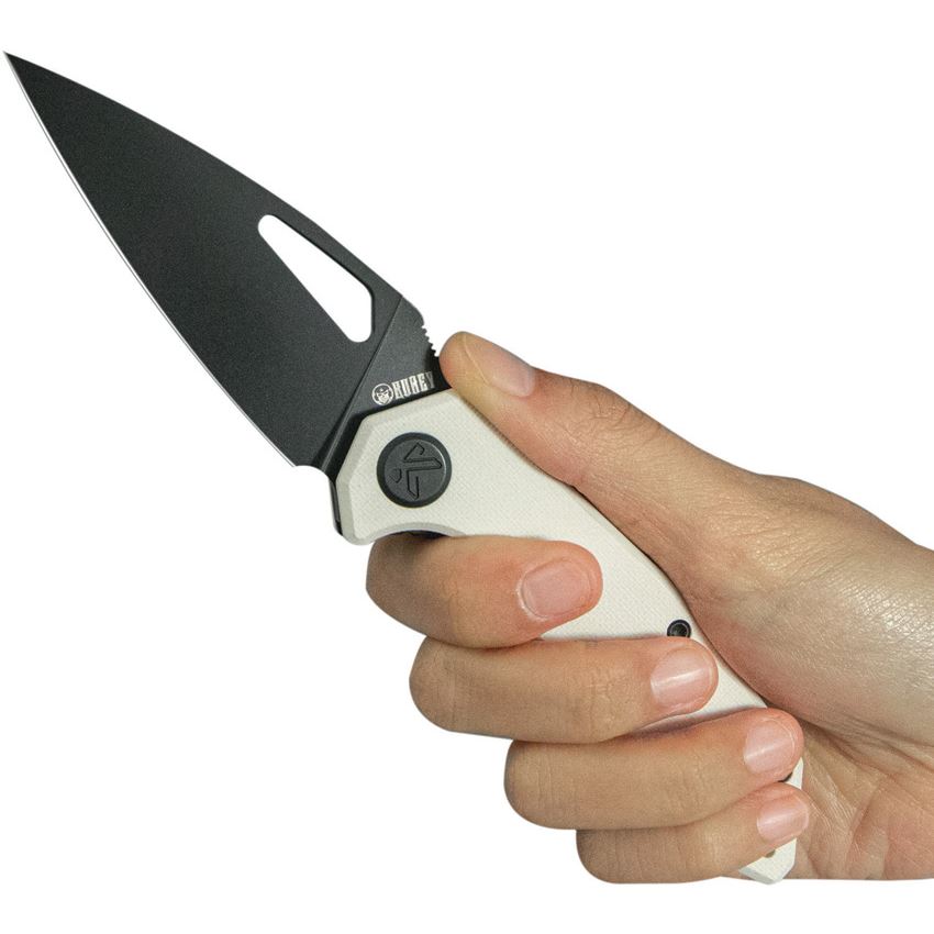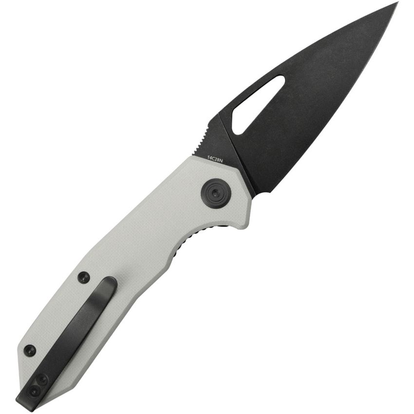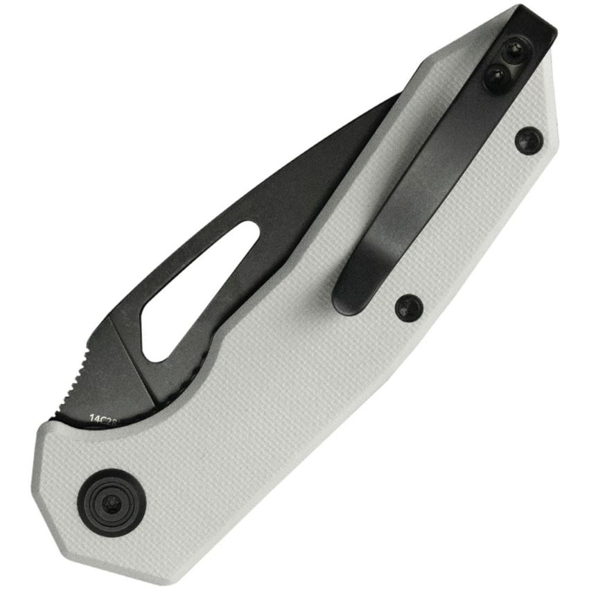 Model/Item/Part Number - KUB122Z. Kubey Knives - Coeus Blackwash 14C28N Linerlock Knife White G10 Handles. 4.13" (10.49cm) closed. 3.13" (7.95cm) BlackWash finish 14C28N Sandvik stainless blade. White G10 handle. Pocket clip. Thumb pull. Boxed. Made in China.