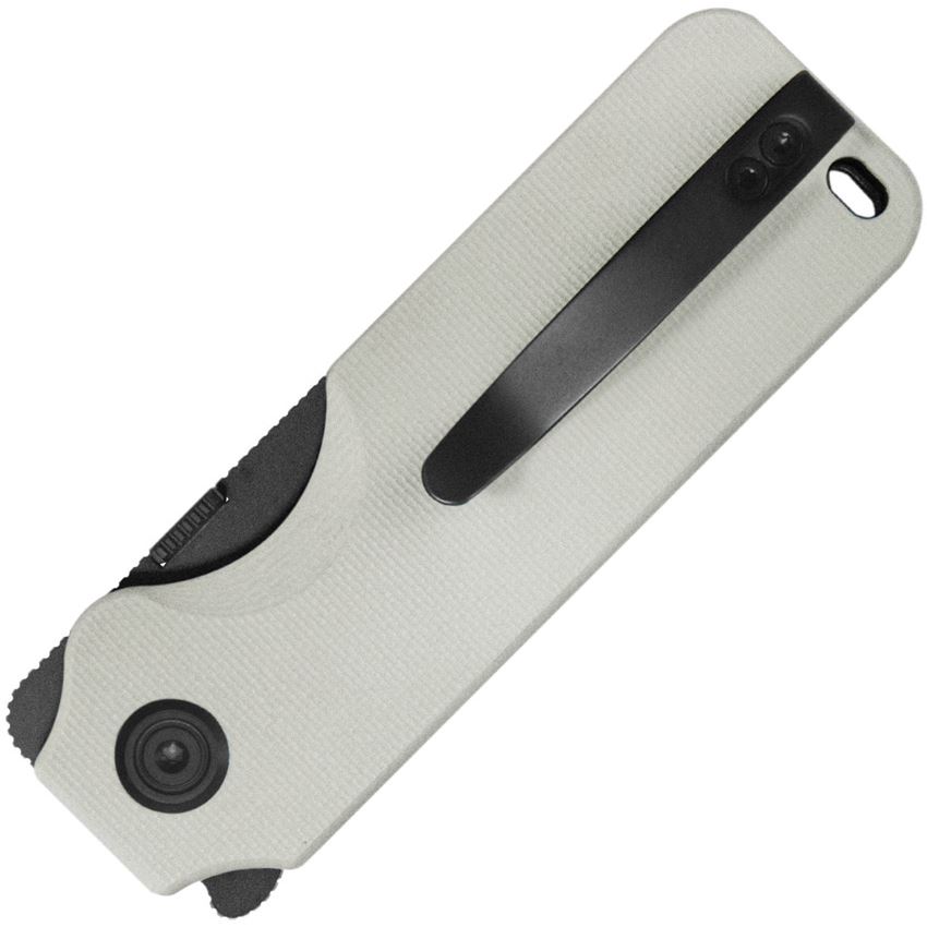 Model/Item/Part Number - KUB407E. Kubey Knives - Boxer Blackwash 14C28N Sheepsfoot Linerlock Knife White G10 Handles. 3.75" (9.53cm) closed. 2.5" (6.35cm) BlackWash finish 14C28N Sandvik stainless sheepsfoot blade. White G10 handle. Thumb disk. Lanyard hole. Pocket clip. Extended tang. Boxed. Made in China.