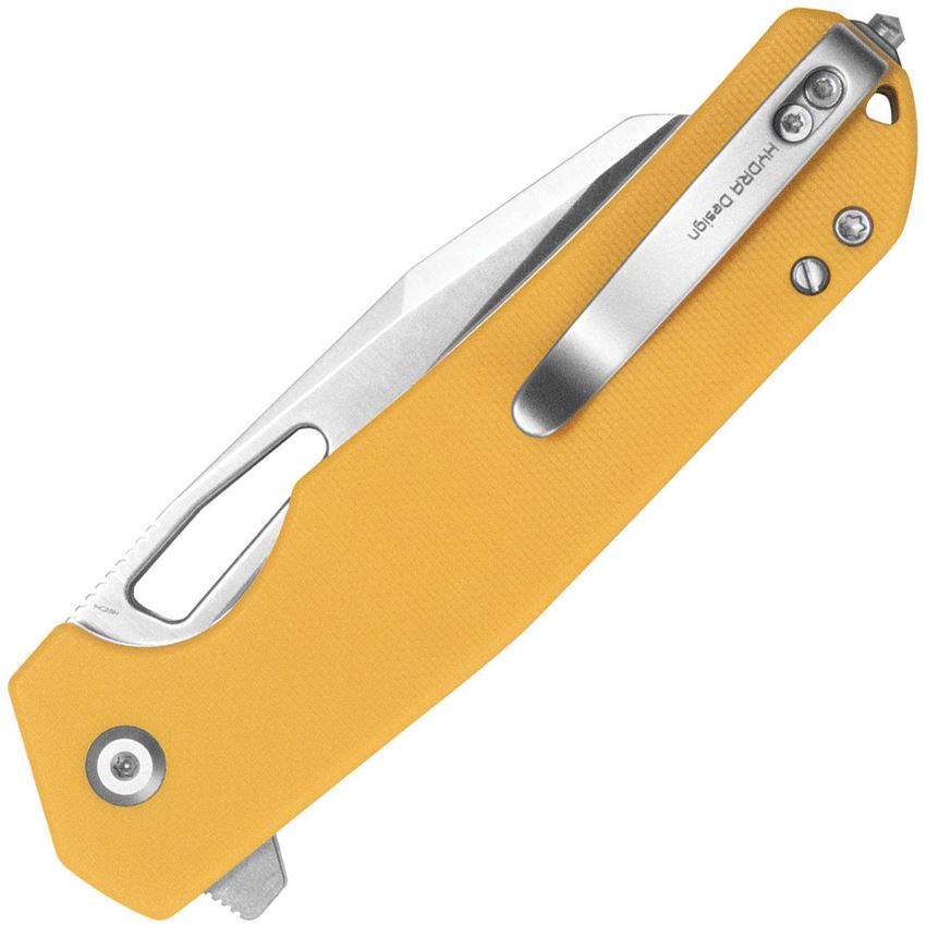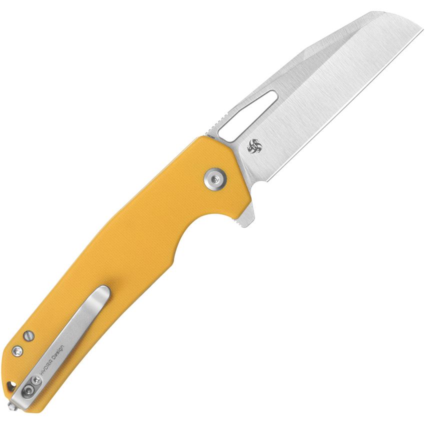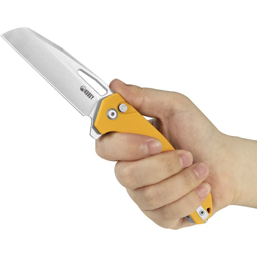 Model/Item/Part Number - KUB363C. Kubey Knives - 10-8 Satin 14C28N Sheepsfoot Button Lock Knife Yellow G10 Handles. 4.75" (12.07cm) closed. 3.13" (7.95cm) satin finish 14C28N Sandvik stainless sheepsfoot blade. Yellow G10 handle. Belt/cord cutter. Glass breaker. Lanyard hole. Pocket clip. Extended tang. Thumb pull. Boxed. Made in China.