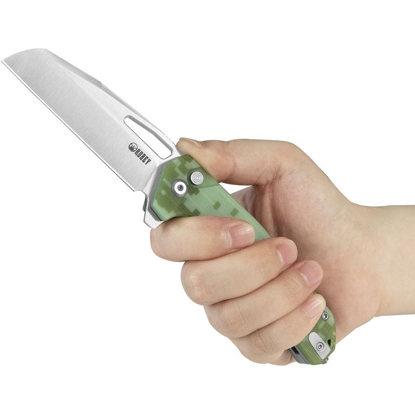 Model/Item/Part Number - KUB363D. Kubey Knives - 10-8 Satin 14C28N Sheepsfoot Button Lock Knife Digital Camo G10 Handles. 4.75" (12.07cm) closed. 3.13" (7.95cm) satin finish 14C28N Sandvik stainless sheepsfoot blade. Digital camo G10 handle. Belt/cord cutter. Glass breaker. Lanyard hole. Pocket clip. Extended tang. Thumb pull. Boxed. Made in China.