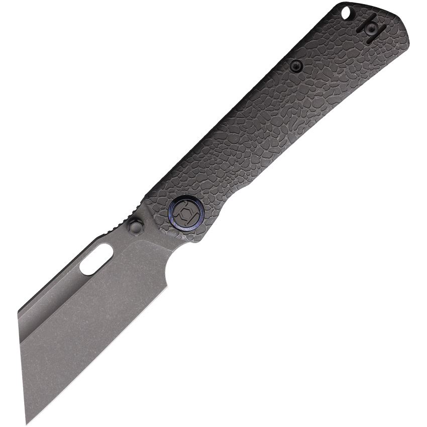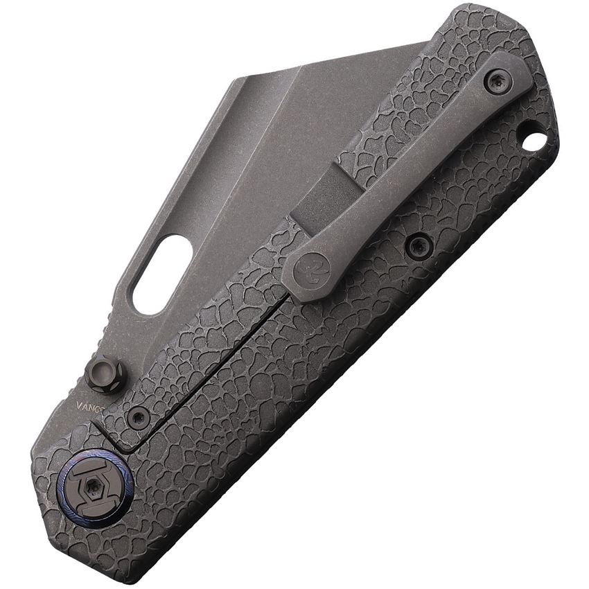 Model/Item/Part Number - KUNK711TR21. Kunwu Knives - Cochise Stonewash Vancron Framelock Knife Honeydew Texture Titanium Handles. 4.5" (11.43cm) closed. 3.5" (8.89cm) gray stonewash finish blade. Honeydew texture titanium handle. Thumb pull. Thumb stud. Lanyard hole. Pocket clip. VANCRON steel blade. Boxed. Made in China.
