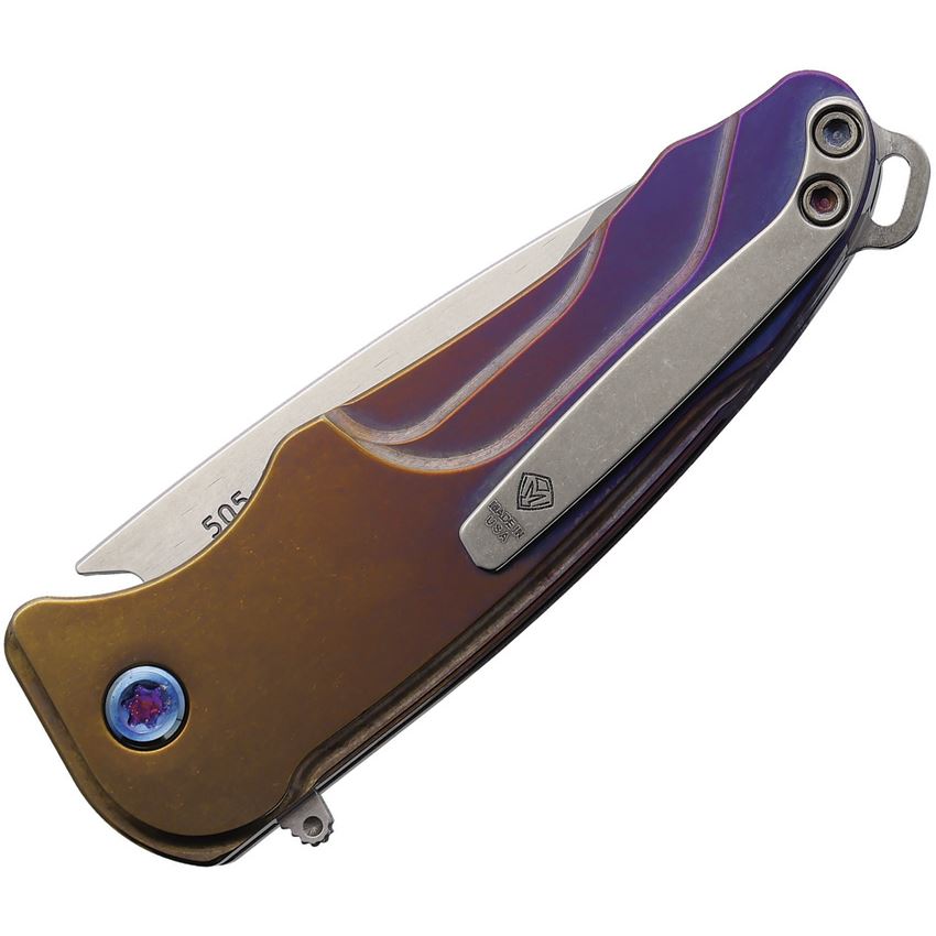 • Bronze and violet fade tumbled finish titanium handle