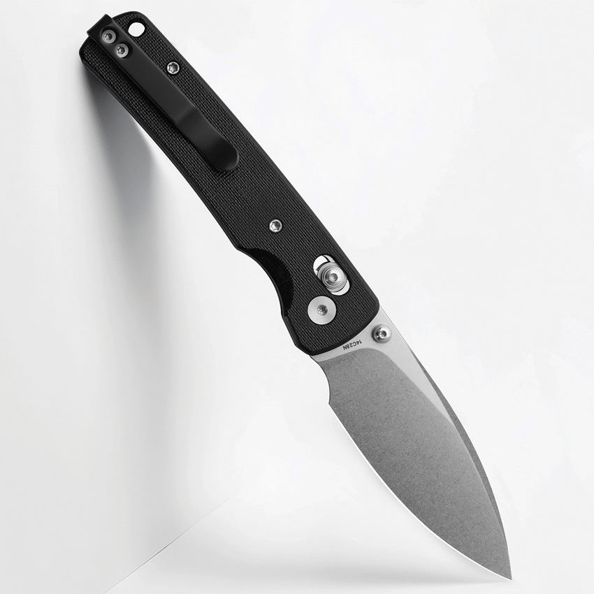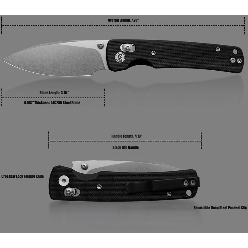 Model/Item/Part Number - MGR817AWBK. Miguron Knives - Vakor Stonewash 14C28N Drop Point Crossbar Lock Knife Black G10 Handles. 4.13" (10.49cm) closed. 3.13" (7.95cm) stonewash finish 14C28N Sandvik stainless drop point blade. Black G10 handle. Thumb stud. Lanyard hole. Pocket clip. Boxed. Made in China.