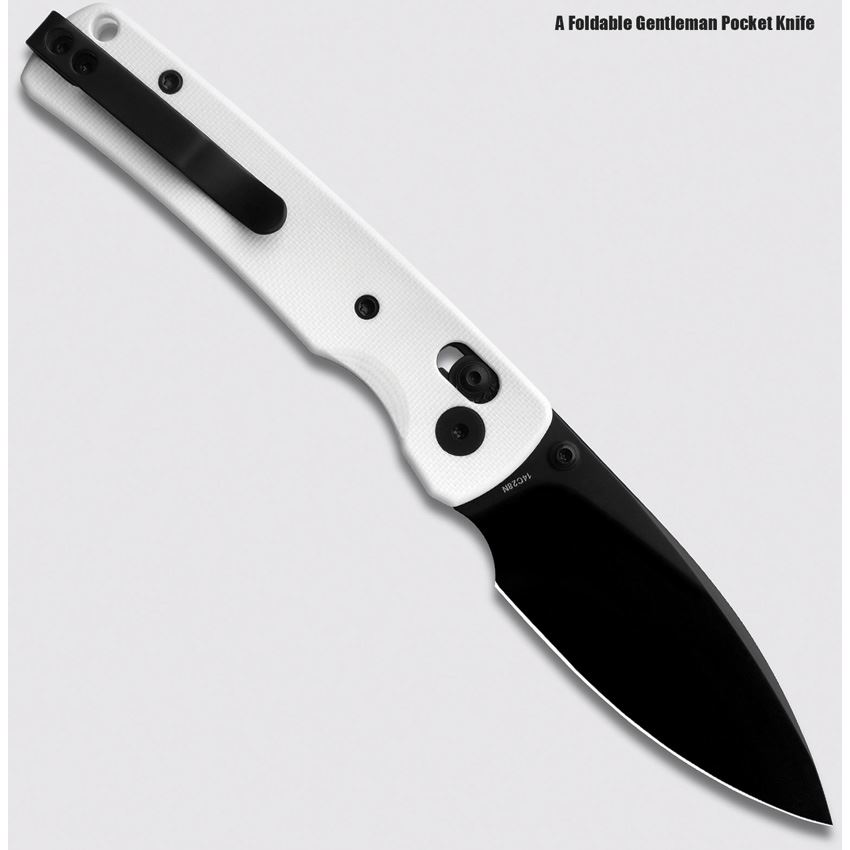 Model/Item/Part Number - MGR817AWH. Miguron Knives - Vakor Black 14C28N Drop Point Crossbar Lock Knife White G10 Handles. 4.13" (10.49cm) closed. 3.13" (7.95cm) black PVD coated 14C28N Sandvik stainless drop point blade. White G10 handle. Thumb stud. Lanyard hole. Pocket clip. Boxed. Made in China.