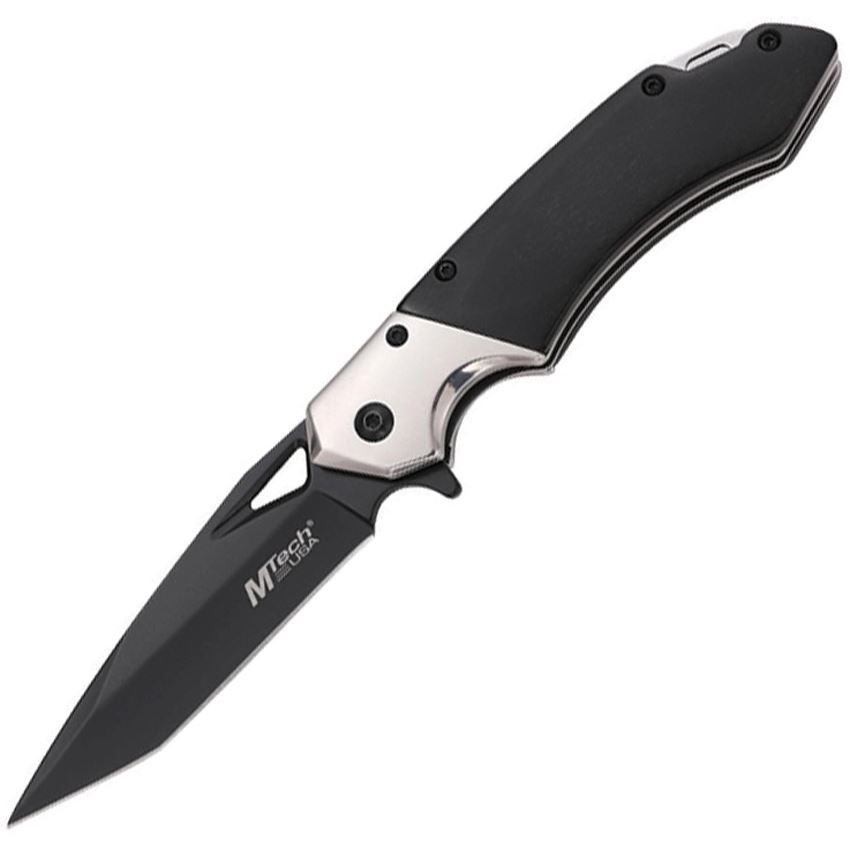 Model/Item/Part Number - MTA2019BK. MTech Knives - Assist Open Black Tanto Linerlock Knife Black Wood Handles. Assisted opening. 4.5" (11.43cm) closed. 3.5" (8.89cm) black TiNi coated stainless tanto blade. Black wood handle. Stainless bolster(s). Thumb pull. Extended tang. Lanyard hole. Pocket clip. Boxed. Made in China.