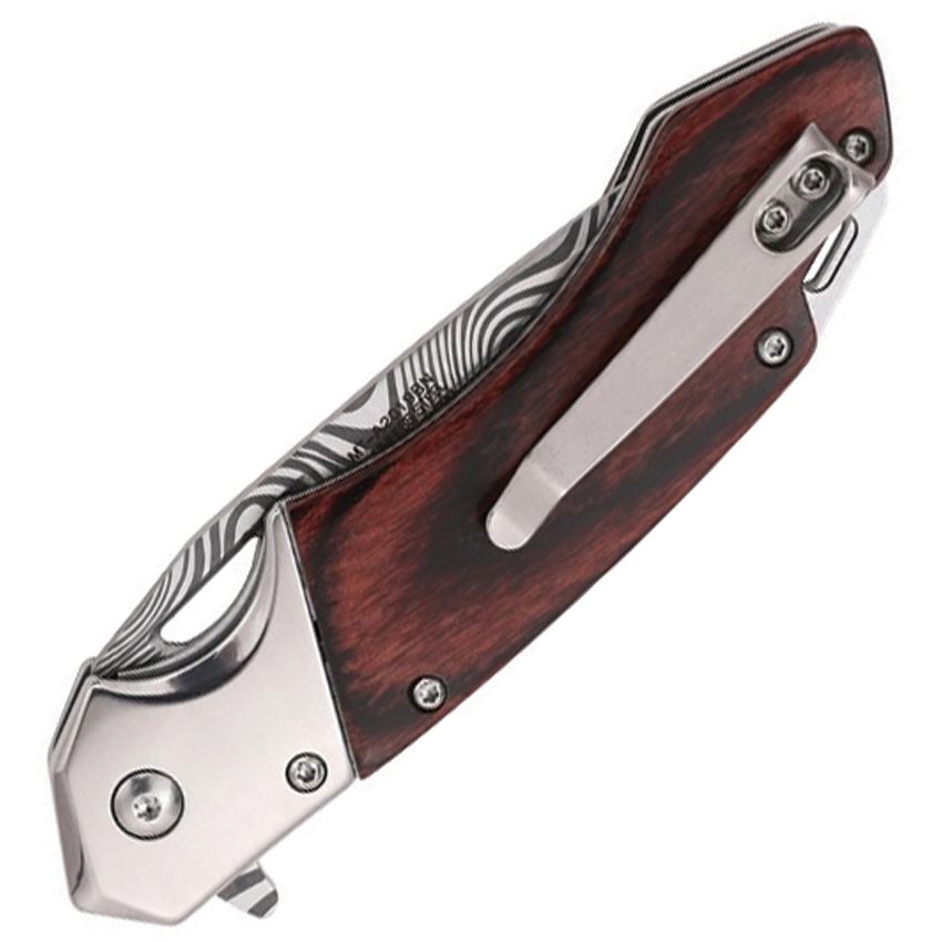Model/Item/Part Number - MTA2019BN. MTech Knives - Assist Open Tanto Linerlock Knife Brown Wood Handles. Assisted opening. 4.5" (11.43cm) closed. 3.5" (8.89cm) stainless tanto blade. Brown wood handle. Stainless bolster(s). Thumb pull. Extended tang. Lanyard hole. Pocket clip. Acid etched Damascus pattern blade. Boxed. Made in China.