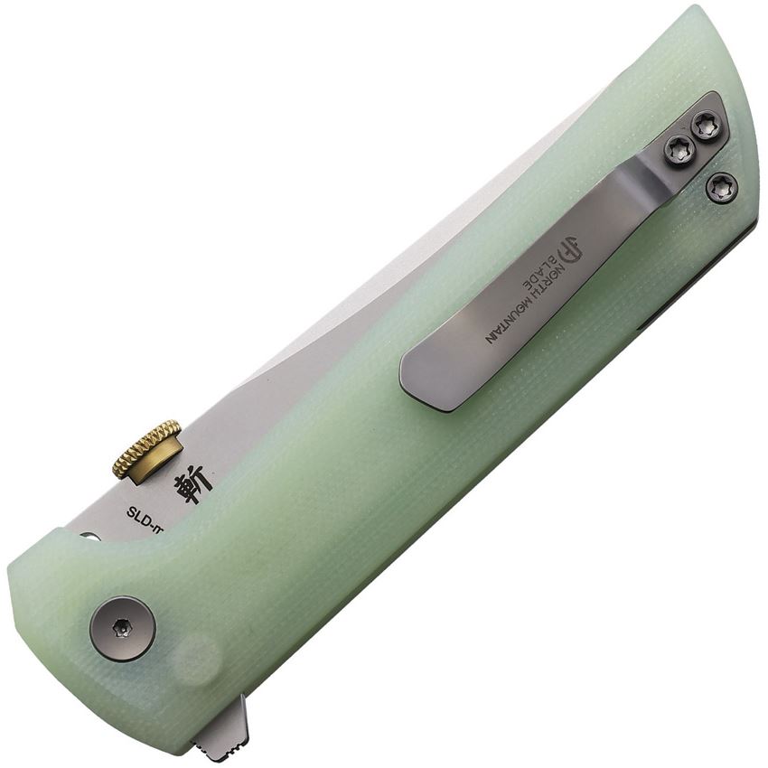 Model/Item/Part Number - NMB2406JD. North Mountain Blade Company - Chop 2 Tanto Button Lock Knife Jade G10 Handles. 4.5" (11.43cm) closed. 3.5" (8.89cm) blade. Jade G10 handle. Extended tang. Pocket clip. SLD-Magic SAN MAI tanto blade. .45 style thumb disk. Black molded plastic storage case. Boxed. Made in China.