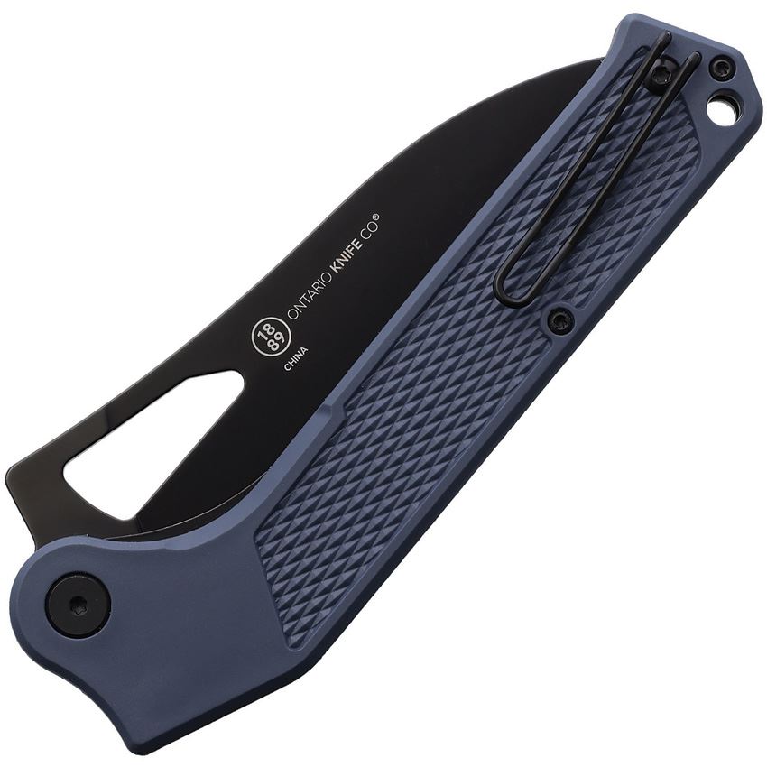Model/Item/Part Number - ON4320GREYTC. Ontario Knife Company - Camp Plus EDC Black Cleaver Linerlock Knife Gray Handles. 5.5" (13.97cm) closed. 4.5" (11.43cm) black powder coated stainless cleaver style blade. Gray textured glass filled nylon handle. Thumb pull. Lanyard hole. Pocket clip. Clam packed. Made in China.
