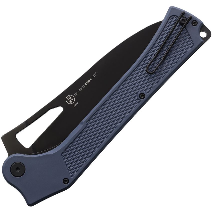 Model/Item/Part Number - ON4325GREY. Ontario Knife Company - Camp Plus EDC Black Cleaver Linerlock Knife Gray Handles. 6.5" (16.51cm) closed. 5.5" (13.97cm) black powder coated stainless cleaver style blade. Gray textured glass filled nylon handle. Thumb pull. Lanyard hole. Pocket clip. Boxed. Made in China.