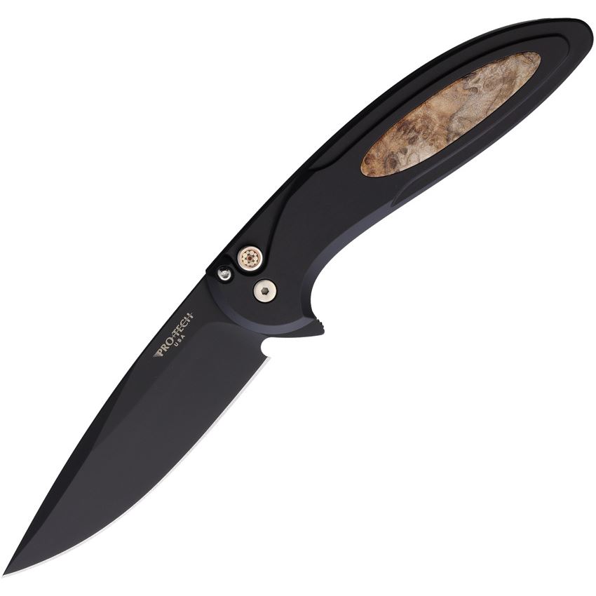 Model/Item/Part Number - PTKCF2103. Pro Tech Knives - Cambria 2 Black DLC MagnaCut Button Lock Knife Black Aluminum Handles. 4.5" (11.43cm) closed. 3.5" (8.89cm) black DLC coated MagnaCut steel blade. Black aluminum handle with Maple burl inlay. Extended tang. Pocket clip. Mosaic button. Boxed. Proudly made in the USA.