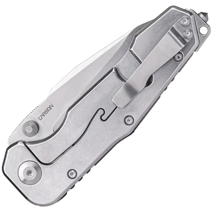 Model/Item/Part Number - RS7911SB. Real Steel Knives - Evolution Ironclad Stonewash D2 Drop Point Framelock Knife Black G10 Handles. 5" (12.7cm) closed. 3.75" (9.53cm) stonewash finish D2 tool steel drop point blade. Black G10 handle with stonewash finish stainless back handle. Lanyard hole. Glass breaker. Thumb stud. Pocket clip. Boxed. Made in China.