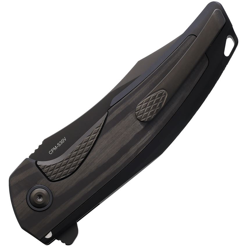 • 3.5 inch (8.89cm) black DLC coated CPM S30V stainless clip point blade
