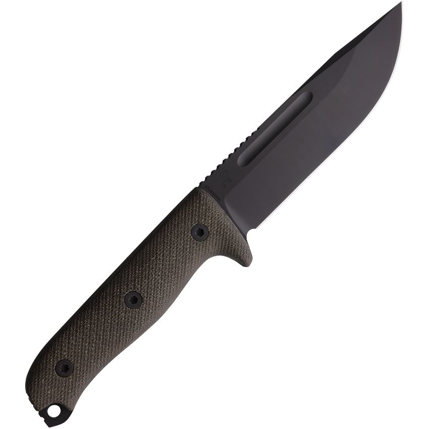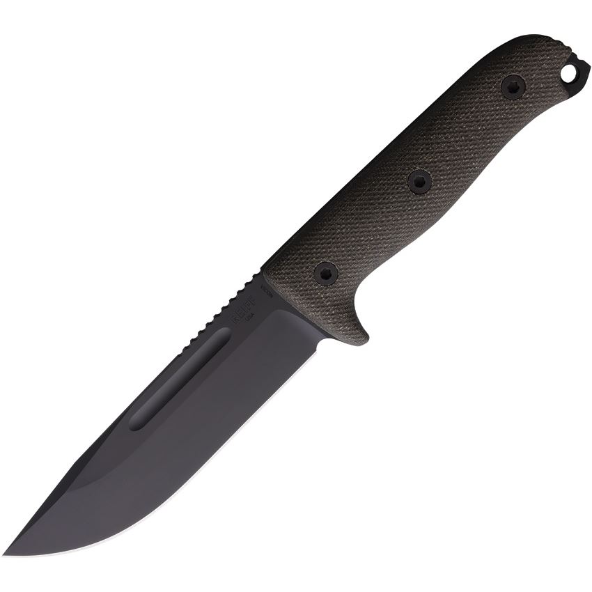 Model/Item/Part Number - REKVN11BGCMBLKA. Reiff Knives - Vicon Black MagnaCut Clip Point Fixed Blade Knife Green Micarta Handles. 10.25" (26.04cm) overall. 5.25" (13.34cm) black DLC coated CPM MagnaCut stainless clip point blade. Green canvas micarta handle. Full, extended tang. Lanyard hole. Flat Saber ground blade. Black Kydex belt sheath. Boxed. Proudly made in the USA.