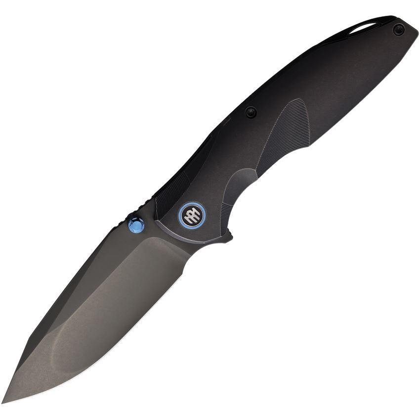 Model/Item/Part Number - RMTRTCLT4. Remette Knives - Cool Whale Black M390 Framelock Knife Blackwash Titanium Handles. 4.5" (11.43cm) closed. 3.5" (8.89cm) black DLC coated Bohler M390 stainless blade. Black stonewash finish titanium handle. Extended tang. Thumb stud. Pocket clip. Blue accents. Black nylon zippered storage case. Boxed. Made in China.