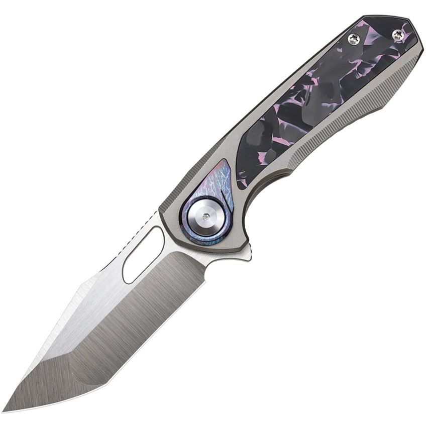 Model/Item/Part Number - RMTASTP2. Remette Knives - Saker Falcon Button Satin S45VN Tanto Framelock Knife Gray/Black-Purple Carbon Fiber Handles. 4.25" (10.8cm) closed. 3" (7.62cm) satin finish hollow ground S45VN stainless tanto blade. Gray titanium handle with Black and purple carbon fiber inlay. Extended tang. Thumb pull. Pocket clip. Lanyard hole. Timascus onlay. Safety lock. Black nylon zippered storage case. Boxed. Made in China.