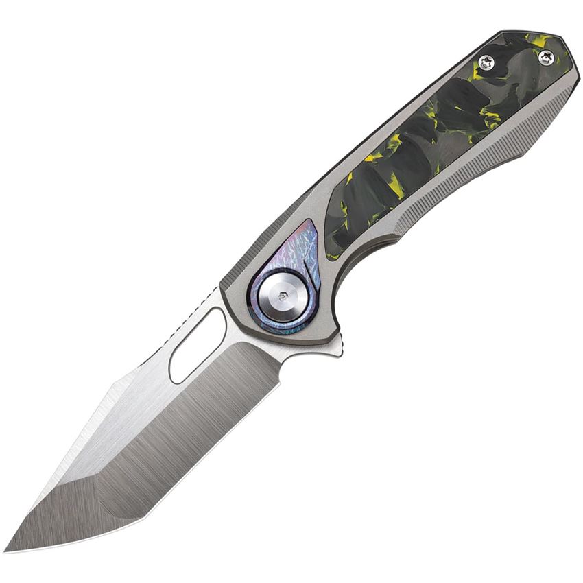 Model/Item/Part Number - RMTASTP3. Remette Knives - Saker Falcon Button Satin S45VN Tanto Framelock Knife Gray/Black-Yellow Carbon Fiber Handles. 4.25" (10.8cm) closed. 3" (7.62cm) satin finish hollow ground S45VN stainless tanto blade. Gray titanium handle with Black and yellow carbon fiber inlay. Extended tang. Thumb pull. Pocket clip. Lanyard hole. Timascus onlay. Safety lock. Black nylon zippered storage case. Boxed. Made in China.