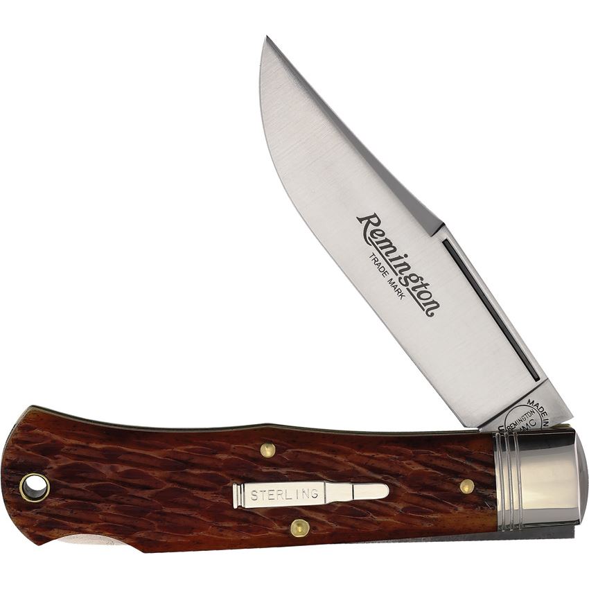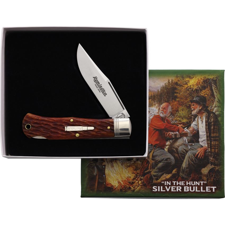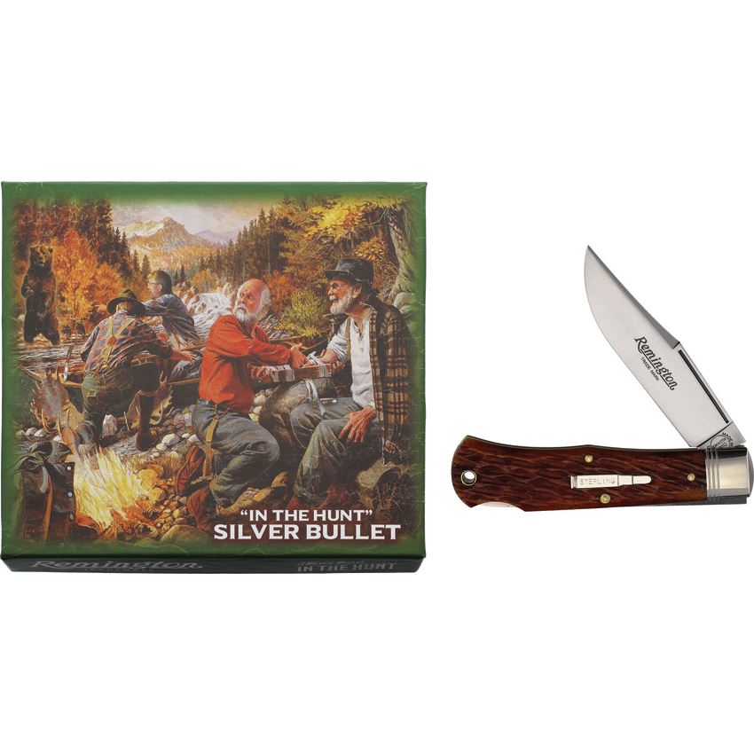 Model/Item/Part Number - R1342SB. Remington Knives - 2026 Silver Bullet Satin 1095HC Lockback Knife Brown Jigged Bone Handles. 4.13" (10.49cm) closed. Satin finish 1095HC steel clip blade. Brown jigged bone handle. Nickel silver bolster(s). Lanyard hole. Cartridge brass liners. Sterling silver bullet inlay shield. Boxed. Proudly made in the USA.