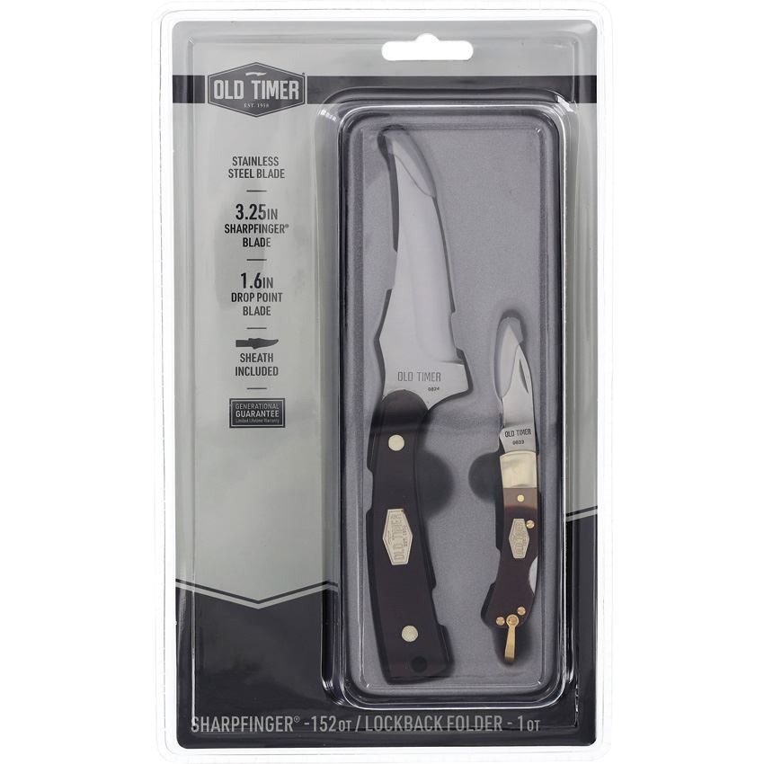 Model/Item/Part Number - SCHP1227067. Schrade Knives - Ot Sharpfinger/Folder Combo Brown Sawcut Delrin Handles. Brown sawcut Delrin handle. Nickel silver bolster(s). Inlay shield. Includes: 7" overall Sharpfinger with 3.25" upswept blade; 2.25" closed lockback with drop point blade and bail; Belt sheath; Gift tin. Clam packed. Made in China.
