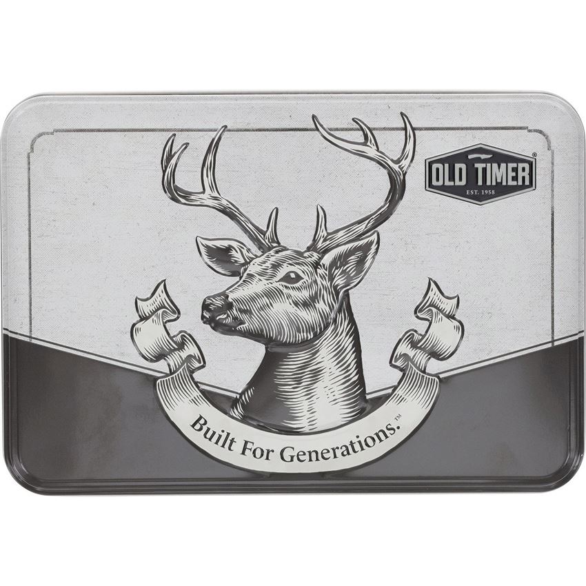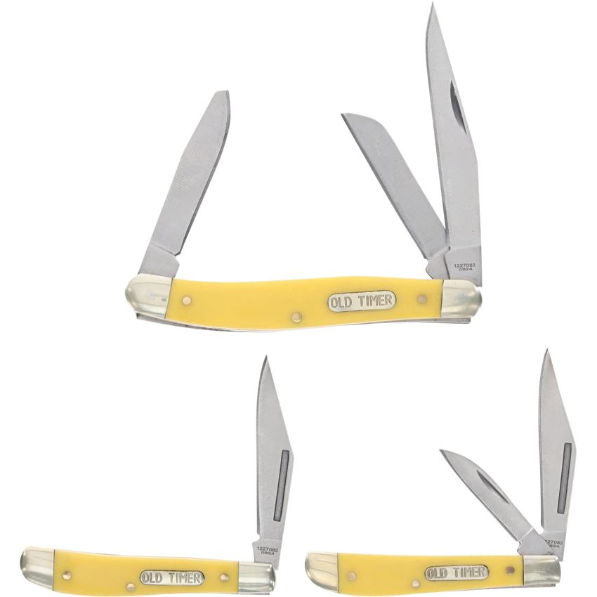 Model/Item/Part Number - SCHP1227082. Schrade Knives - Old Timer Folder Knife Combo Delrin Handles. Satin finish stainless blade(s). Yellow smooth Delrin handle. Nickel silver bolster(s). Lanyard hole. Includes: 4" closed folder with clip, sheepsfoot, and spey blades; 2.75" closed folder with clip and pen blades; 2.75" closed folder with clip blade; Gift tin. Clam packed. Made in China.