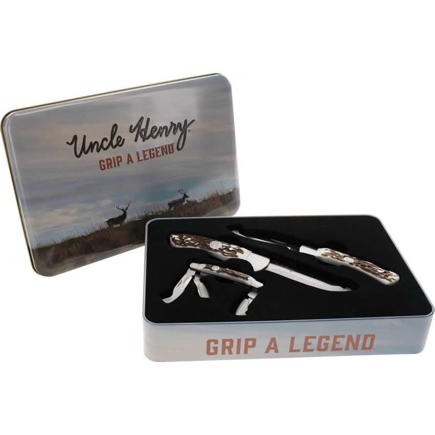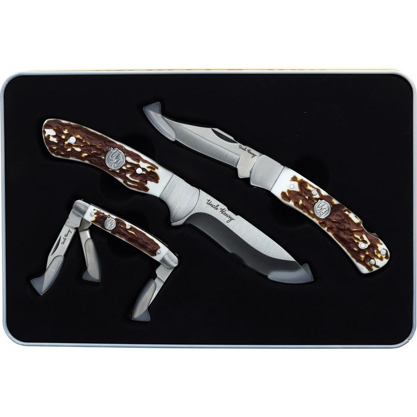 Model/Item/Part Number - SCHP1227079. Schrade Knives - UH 2 Fixed/Folder Combo Delrin Stag Handles. Delrin stag handle. Stainless bolster(s). Inlay shield. Includes: 7" overall fixed blade with 3" drop point blade; 3.75" closed linerlock with 2.75" clip point blade; 2.75" closed folder with clip, sheepsfoot, and pen blades; Gift tin. Clam packed. Made in China.