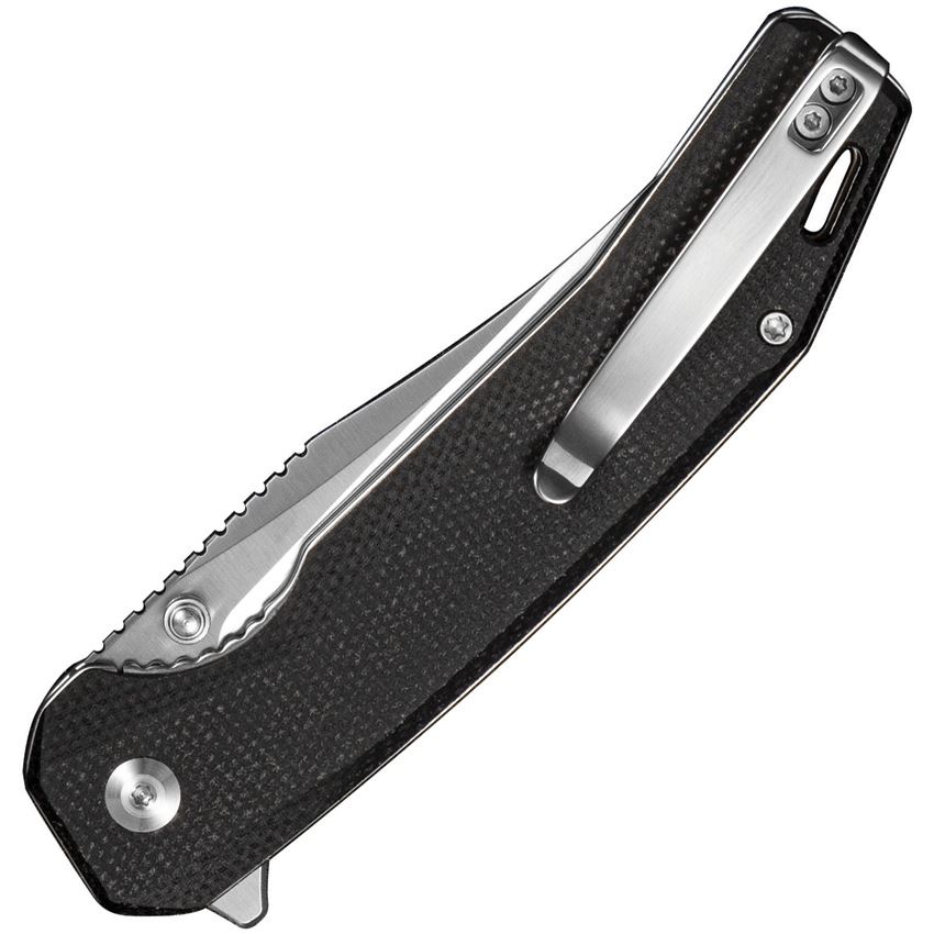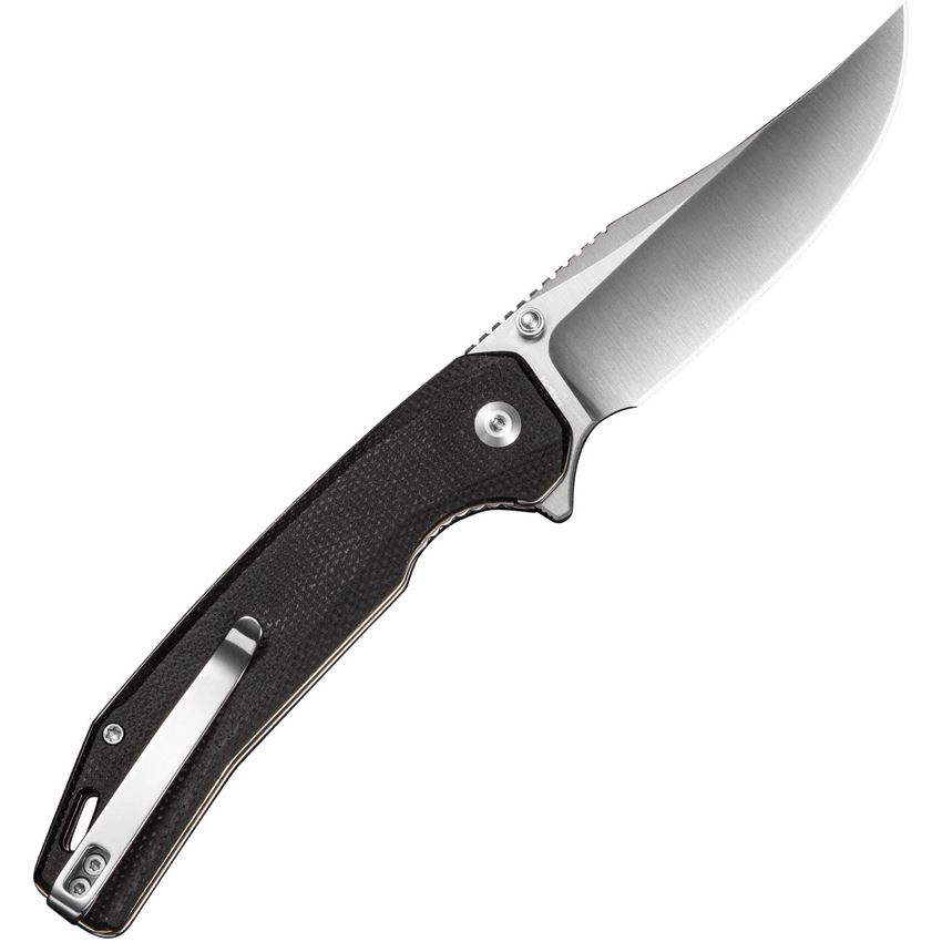 Model/Item/Part Number - S250382. SenCut Knives - Vornix Satin 9CR18MOV Clip Point Linerlock Knife Black Canvas Micarta Handles. 4.75" (12.07cm) closed. 3.63" (9.22cm) satin finish 9Cr18MoV stainless clip point blade. Black canvas micarta handle. Extended tang. Thumb stud. Lanyard hole. Pocket clip. Black nylon zippered storage case. Boxed. Made in China.