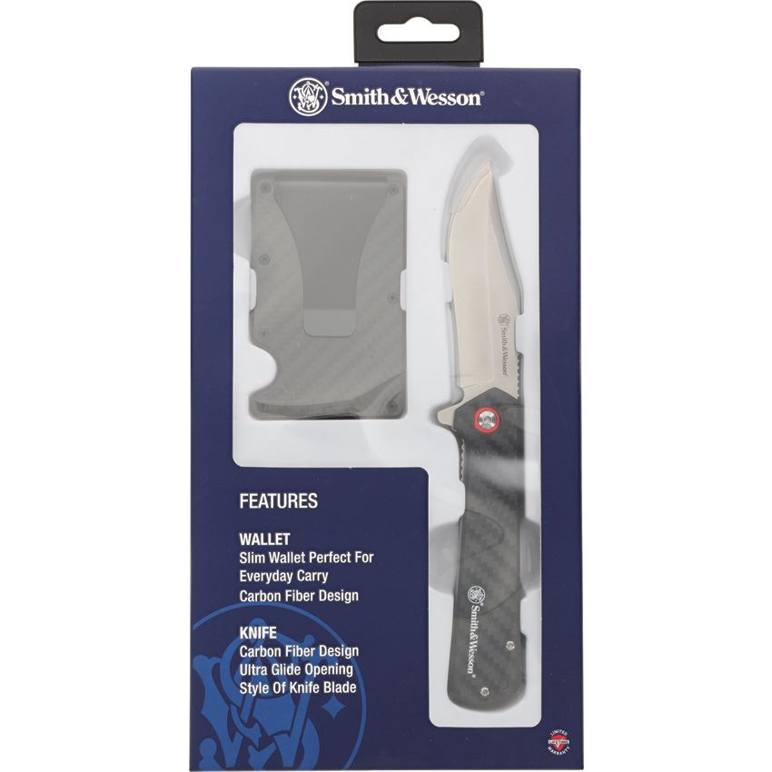Model/Item/Part Number - SWP1227072. Smith & Wesson Knives - Linerlock/Wallet Combo. 4.5" (11.43cm) closed. 3.25" (8.26cm) satin finish stainless blade. Carbon fiber pattern synthetic handle. Extended tang. Lanyard hole. Pocket clip. Includes 3.4" overall carbon fiber design wallet for every day carry. Money clip. Boxed with hanging tab. Made in China.