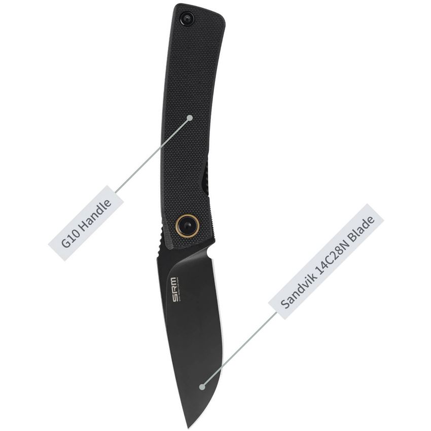 Model/Item/Part Number - SRM105MGB. SRM Knives - Air Blackwash 14C28N Linerlock Knife Black G10 Handles. 4" (10.16cm) closed. 3" (7.62cm) black stonewash finish 14C28N Sandvik stainless blade. Black G10 handle. Pocket clip. Boxed. Made in China.