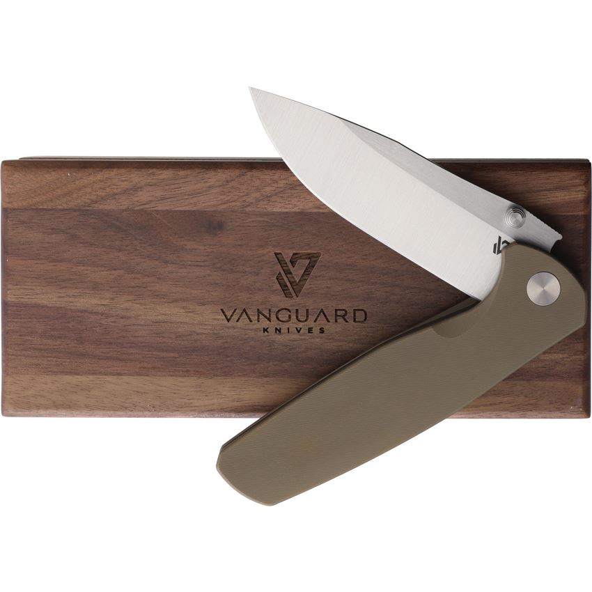 Model/Item/Part Number - VANG044. Vanguard Knives - ESOX Satin M390 Framelock Knife Stonewash Bronze Finish Titanium Handles. 4.5" (11.43cm) closed. 3.75" (9.53cm) satin finish Bohler M390 stainless blade. Bronze stonewash finish titanium handle. Thumb stud. Pocket clip. Comes with additional Timascus pocket clip. Boxed. Made in China.