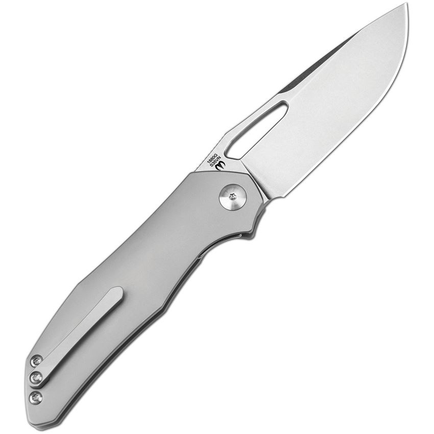 Model/Item/Part Number - ATZ1880GGY. Artisan Knives - Keras Stonewash Drop Point Framelock Gray Titanium Handles. 4.25" (10.8cm) closed. 3.25" (8.26cm) stonewash finish S35VN stainless drop point blade. Gray titanium handle. Thumb pull. Pocket clip. Black nylon zippered storage case. Boxed. Made in China.