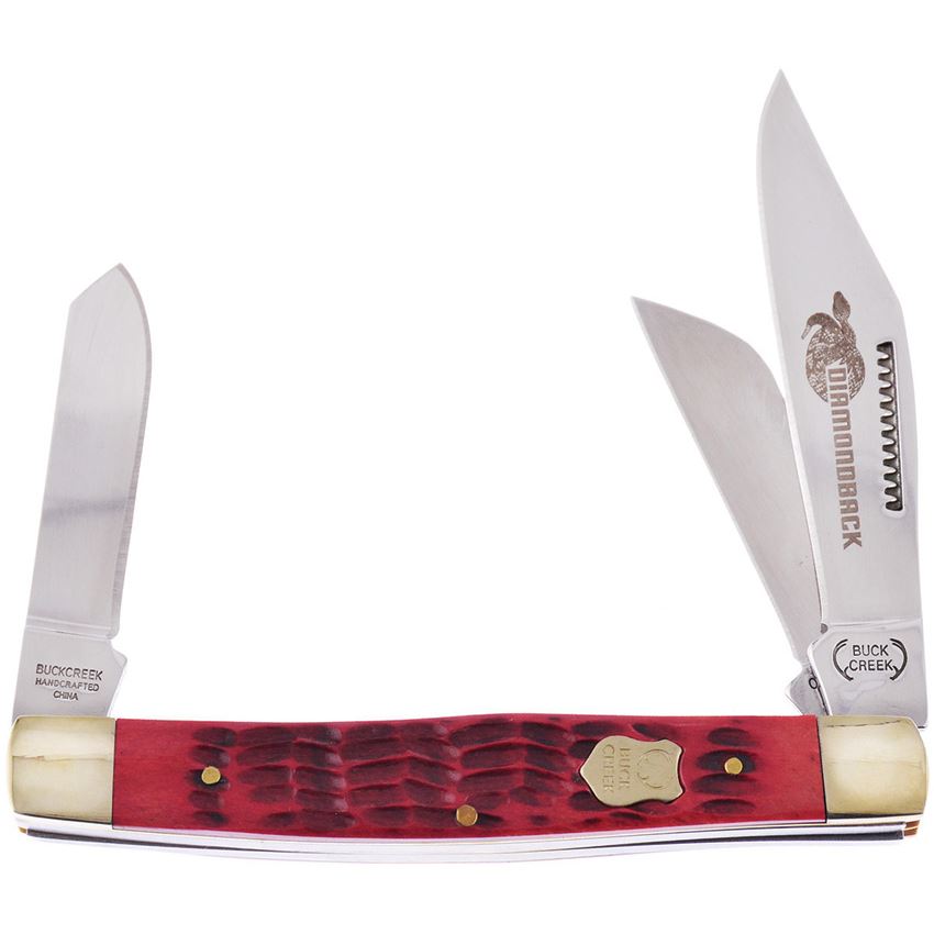 Model/Item/Part Number - BCI659RPB. Buckcreek International Knives - Big Diamondback Red Bone Handles. 4.5" (11.43cm) closed. Satin finish stainless clip, sheepsfoot, and spey blades. Red pick bone handle. Nickel silver bolster(s). Inlay shield. Boxed. Made in China.