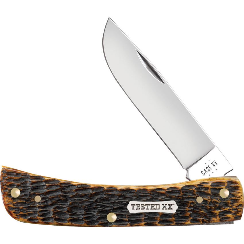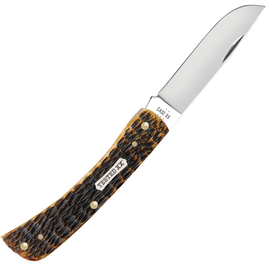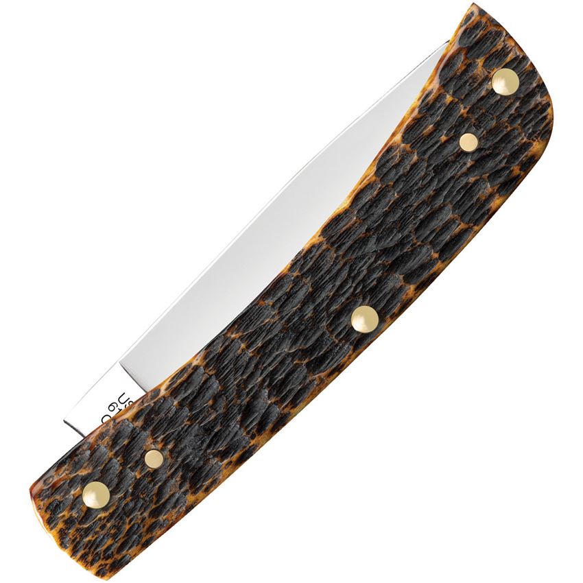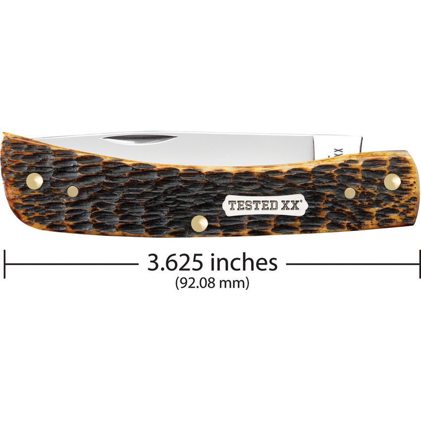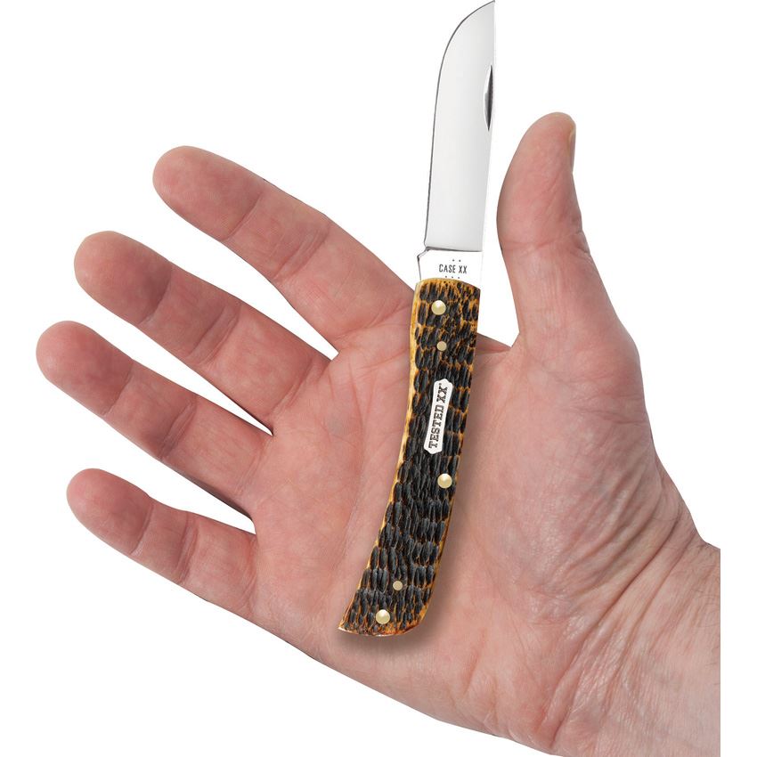 Model/Item/Part Number - CA51394. Case XX Knives - Sod Buster Jr Knife Burnt Amber Bone Handles. 6137 CS pattern. 3.63" (9.22cm) closed. Mirror finish carbon steel skinner blade. Burnt Amber jigged bone handle. Inlay shield. Boxed. Made in USA.