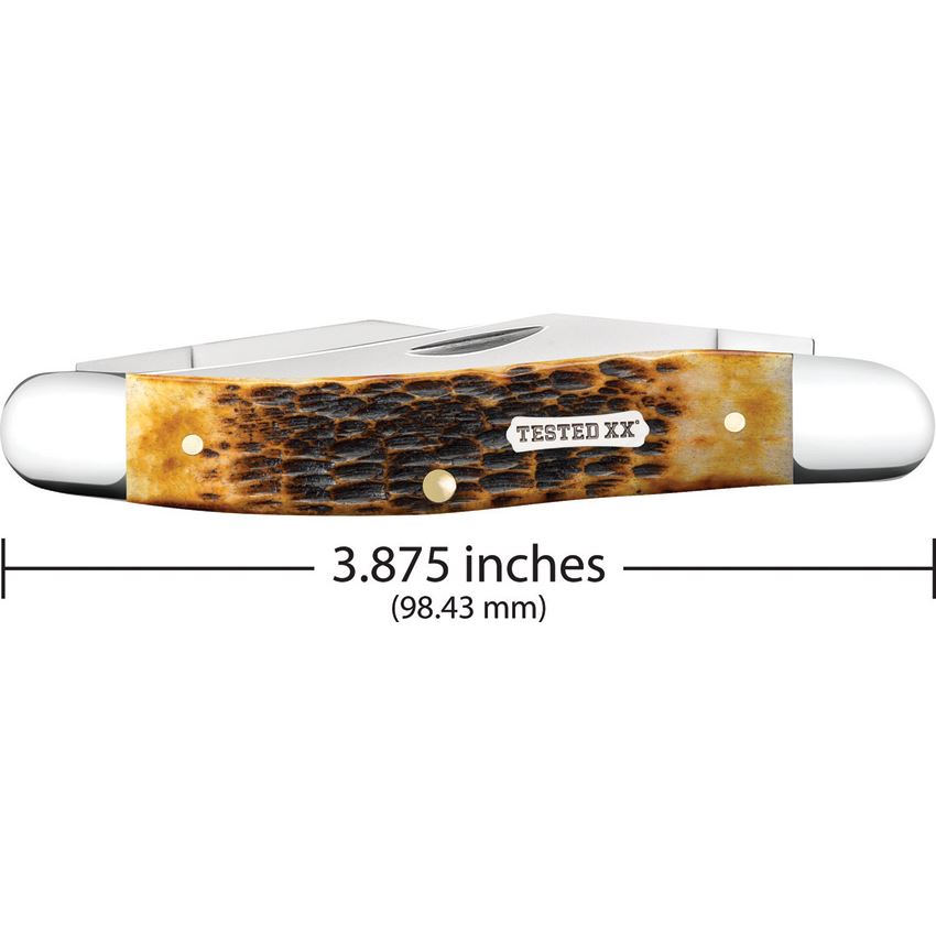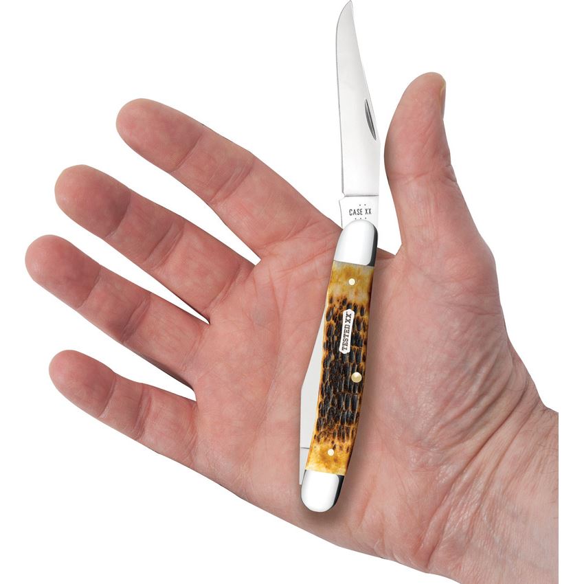 Model/Item/Part Number - CA51395. Case XX Knives - Muskrat Knife Burnt Amber Bone Handles. MUSKRAT CS pattern. 3.88" (9.86cm) closed. Mirror finish carbon steel dual clip blade. Burnt Amber jigged bone handle. Nickel silver bolster(s). Inlay shield. Boxed. Made in USA.
