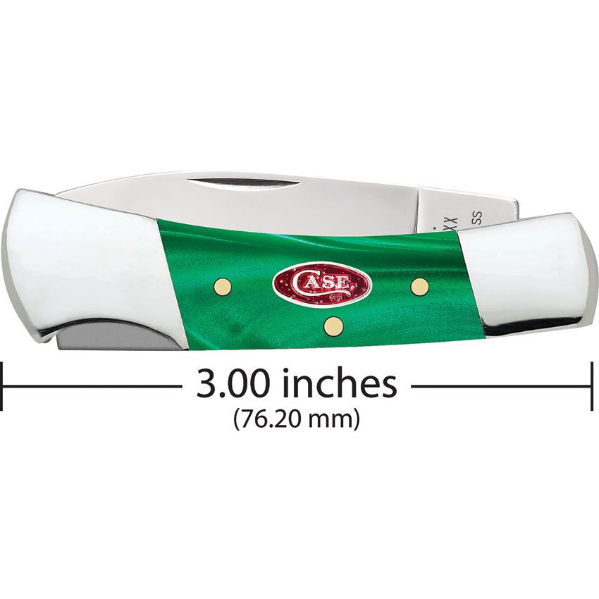 Model/Item/Part Number - CA24415. Case XX Knives - Lockback Knife Green Pearl Kirinite Handles. 101225L SS pattern. 3" (7.62cm) closed. Mirror finish stainless drop point blade. Green pearl Kirinite handle. Nickel silver bolster(s). Inlay shield. Boxed. Made in USA.