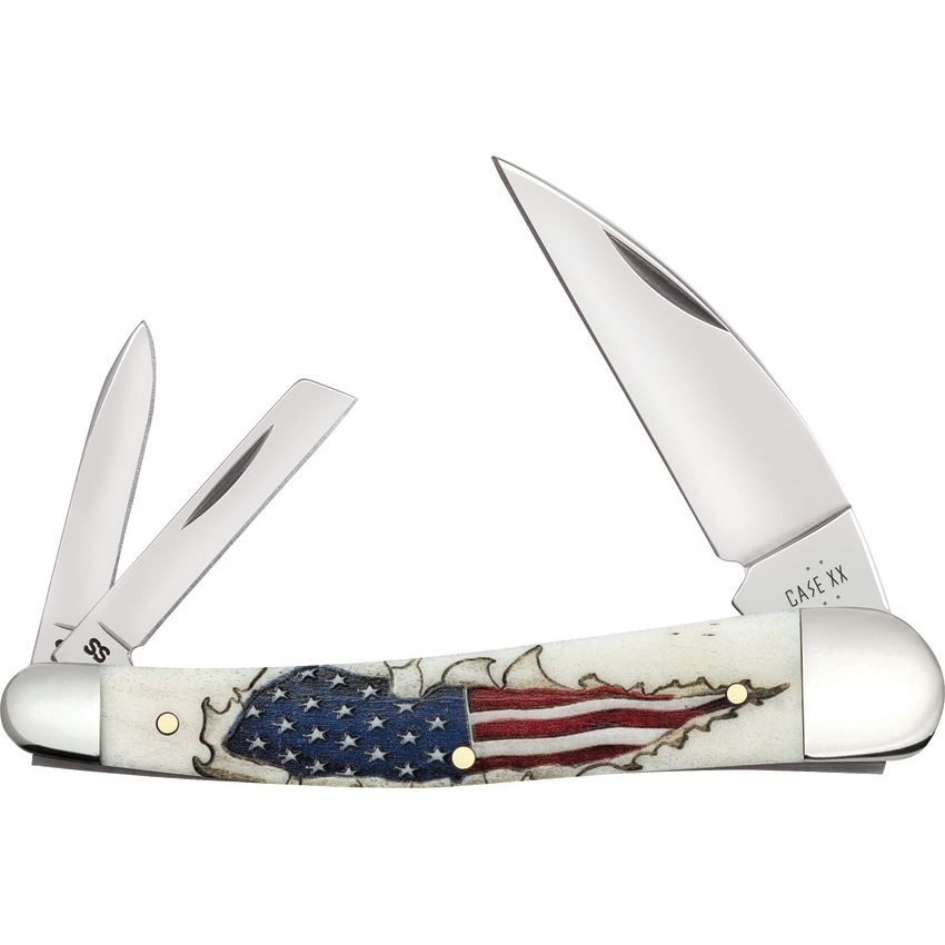 Model/Item/Part Number - CA10844. Case XX Knives - Seahorse Whittler Knife Flag Handles. 6355WH SS pattern. 4" (10.16cm) closed. Mirror finish stainless Wharncliffe, pen, and coping blades. Natural smooth bone handle. Nickel silver bolster(s). Flag handle embellishment. Boxed. Made in USA.