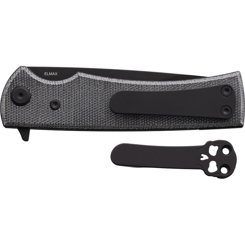 Model/Item/Part Number - CHAV14322. Chaves Knives - Liberation Street Black Drop Point Linerlock Knife Black Micarta Handles. 4.25" (10.8cm) closed. 3.25" (8.26cm) black PVD coated Elmax steel drop point blade. Black canvas micarta handle. Extended tang. Pocket clip. Includes extra skull pocket clip. Boxed. Made in China.