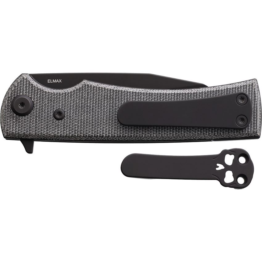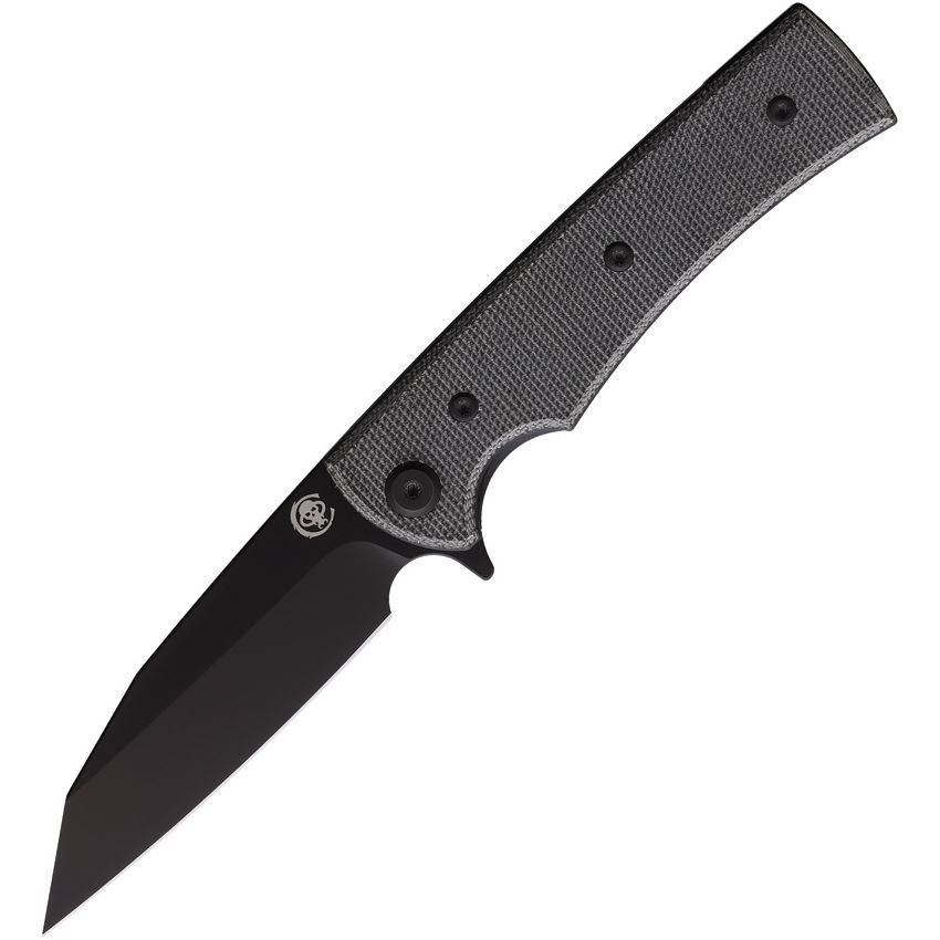 Model/Item/Part Number - CHAV14325. Chaves Knives - Sangre Street Black Wharncliffe Linerlock Knife Black Micarta Handles. 4.25" (10.8cm) closed. 3.25" (8.26cm) black PVD coated Elmax steel Wharncliffe blade. Black canvas micarta handle. Pocket clip. Extended tang. Includes extra skull pocket clip. Boxed. Made in China.