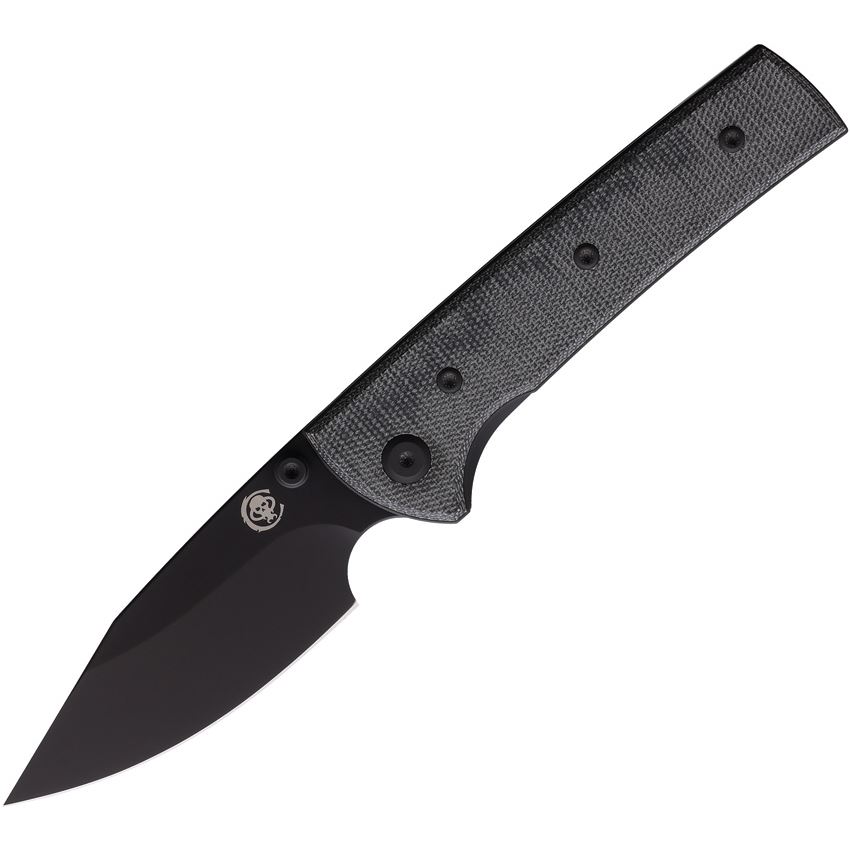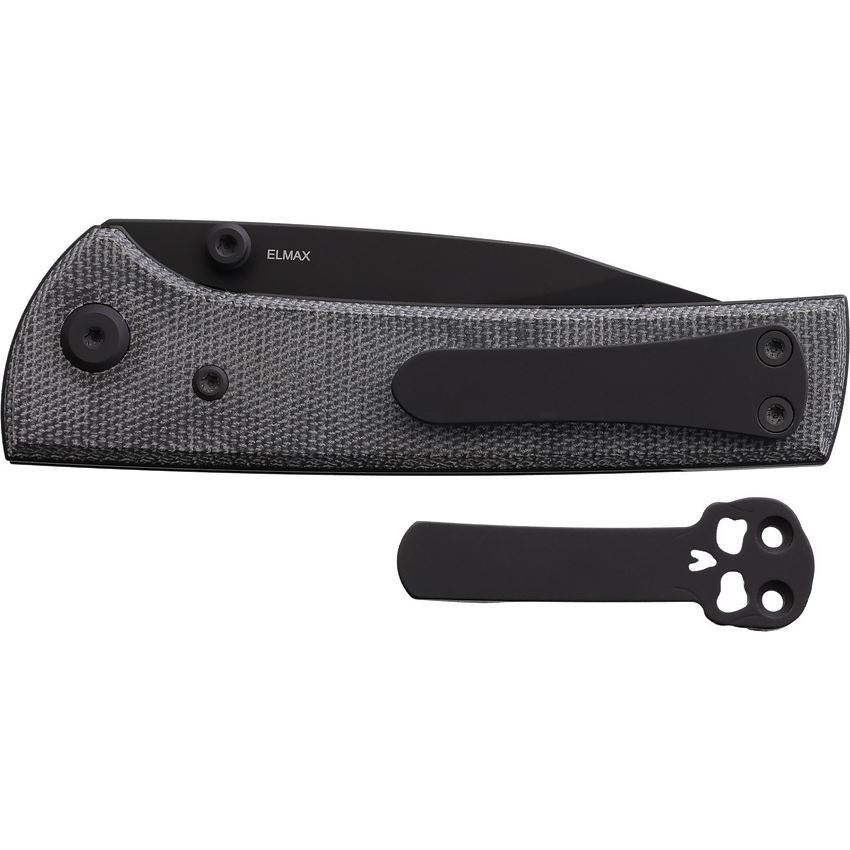 Model/Item/Part Number - CHAV14327. Chaves Knives - Scapegoat Street Black Spear Point Linerlock Knife Black Micarta Handles. 4.38" (11.13cm) closed. 3.38" (8.59cm) black PVD coated Elmax steel spear point blade. Black canvas micarta handle. Thumb stud. Pocket clip. Includes extra skull pocket clip. Boxed. Made in China.