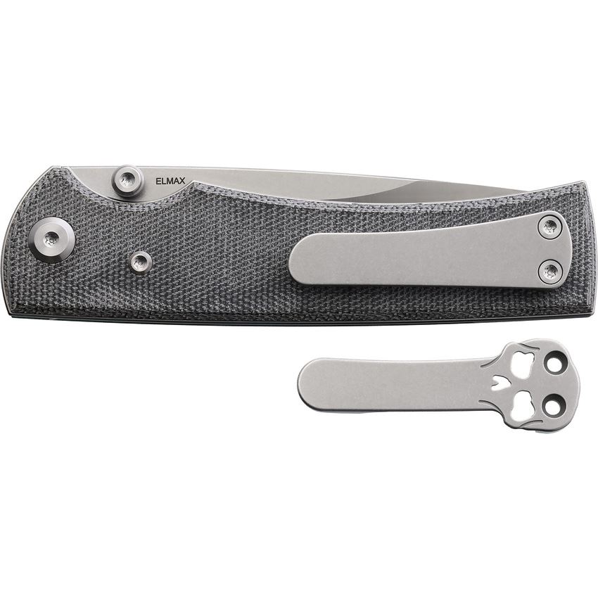 Model/Item/Part Number - CHAV14312. Chaves Knives - Liberation 229 Two-Tone Drop Point Linerlock Knife Black Micarta Handles. 4.5" (11.43cm) closed. 3.5" (8.89cm) stonewash and satin finish Elmax steel drop point blade. Black canvas micarta handle. Thumb stud. Pocket clip. Includes extra skull pocket clip. Boxed. Made in China.