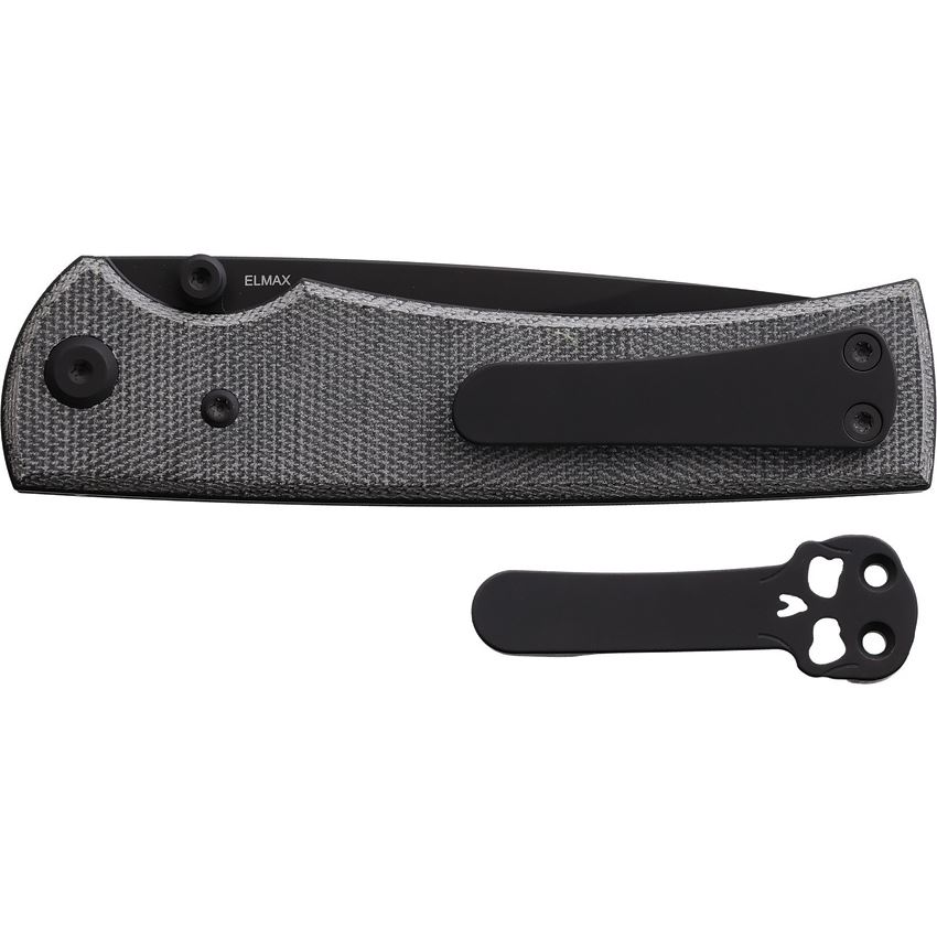Model/Item/Part Number - CHAV14314. Chaves Knives - Liberation 229 Black Drop Point Linerlock Knife Black Micarta Handles. 4.5" (11.43cm) closed. 3.5" (8.89cm) black PVD coated Elmax steel drop point blade. Black canvas micarta handle. Thumb stud. Pocket clip. Includes extra skull pocket clip. Boxed. Made in China.