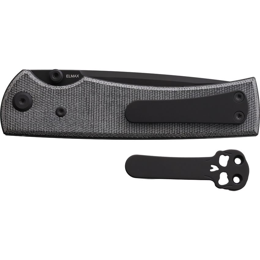 Model/Item/Part Number - CHAV14315. Chaves Knives - Liberation 229 Black Tanto Point Linerlock Knife Black Micarta Handles. 4.5" (11.43cm) closed. 3.5" (8.89cm) black PVD coated Elmax steel tanto blade. Black canvas micarta handle. Thumb stud. Pocket clip. Includes extra skull pocket clip. Boxed. Made in China.