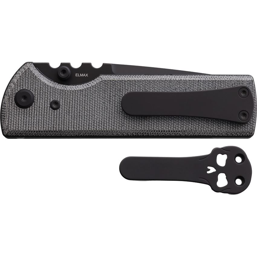 Model/Item/Part Number - CHAV14330. Chaves Knives - NTAK Black Drop Point Linerlock Knife Black Micarta Handles. 4.5" (11.43cm) closed. 3.63" (9.22cm) black PVD coated Elmax steel drop point blade. Black canvas micarta handle. Thumb stud. Pocket clip. Includes extra skull pocket clip. Boxed. Made in China.