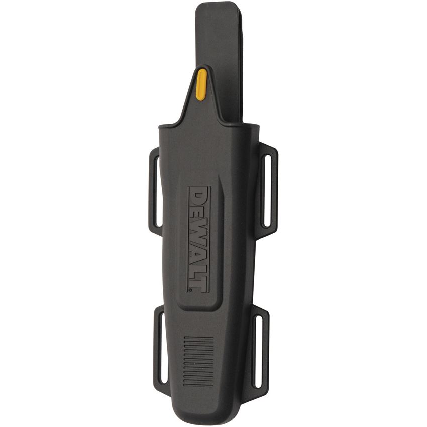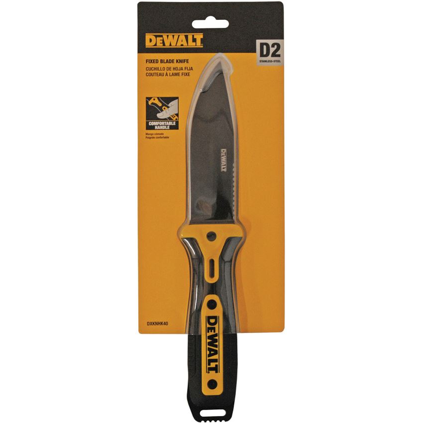 Model/Item/Part Number - DXKNHK40. Dewalt Knives - HK 40 Black D2 Drop Point Fixed Blade Knife Black/Yellow Handles. 10" (25.4cm) overall. 4.5" (11.43cm) black finish D2 tool steel drop point blade. Black and yellow rubberized nylon handle. Full, extended tang. Lanyard hole. Black ABS belt sheath. Clam packed. Made in China.