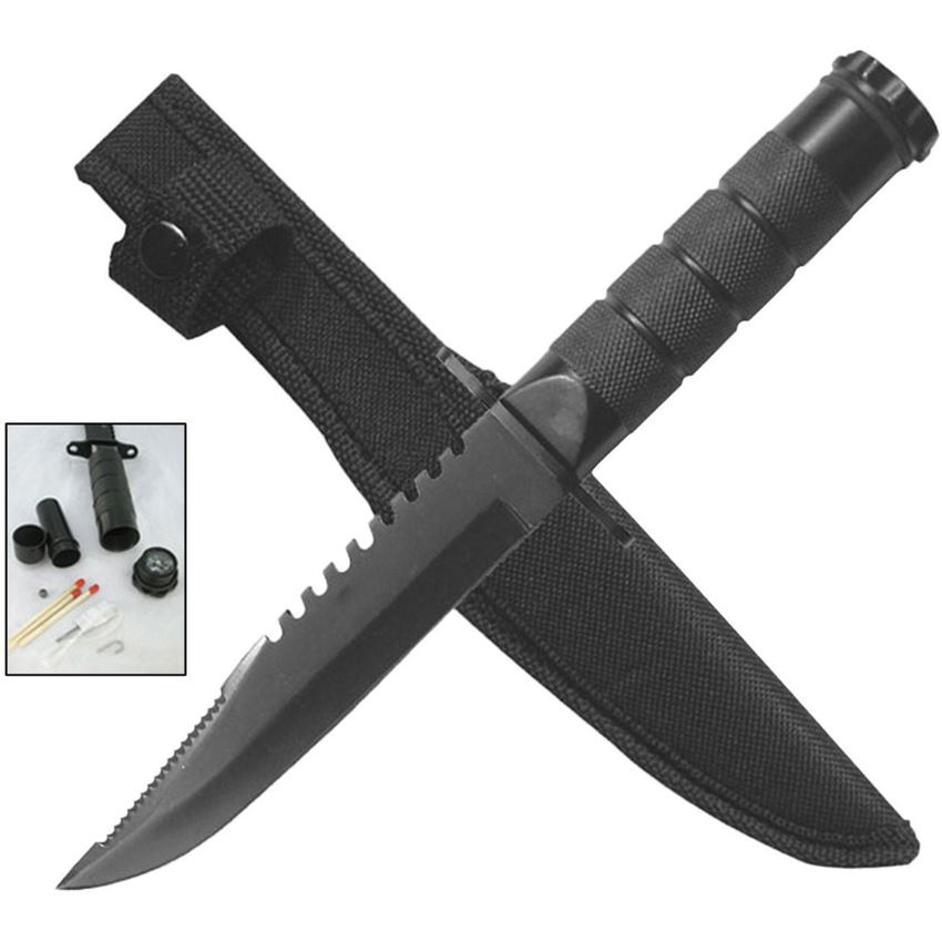 Model/Item/Part Number - EE20690B. ElitEdge - Survival Fixed Blade Knife Black. 8.5" (21.59cm) overall. 4.75" (12.07cm) black finish sawback stainless clip point blade. Black textured metal alloy handle. Steel guard. Small survival kit hidden (matches, fishing line and hook, compass) in handle. Black nylon belt sheath. Boxed. Made in China.