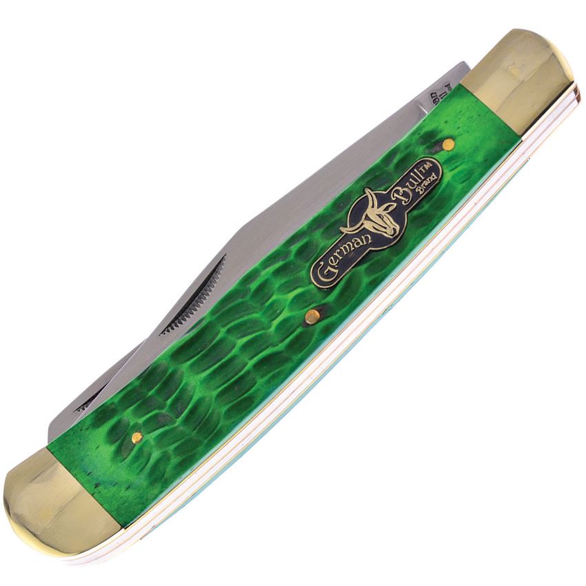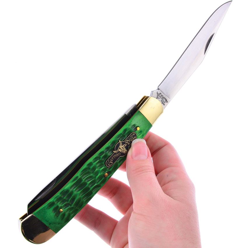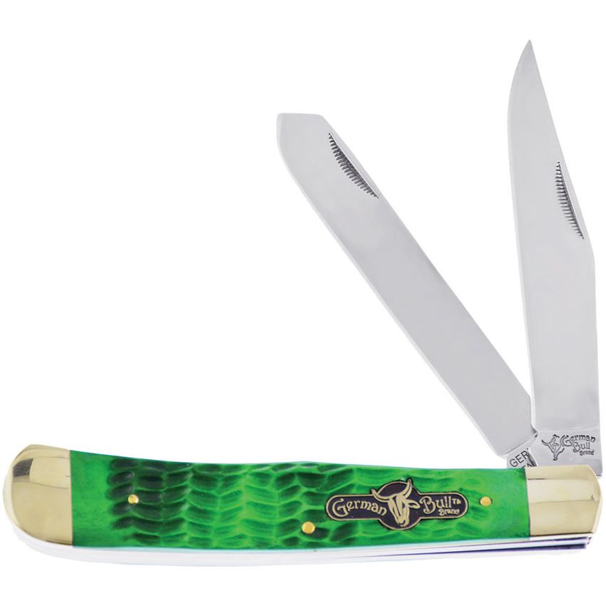 Model/Item/Part Number - GBI010AGB. German Bull Knives - Trapper Knife Green Bone Handles. 4.5" (11.43cm) closed. Satin finish stainless clip and spey blades. Antique green jigged bone handle. Nickel silver bolster(s). Inlay shield. Boxed. Made in China.