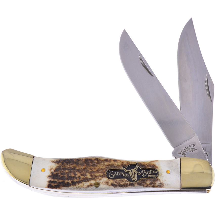 Model/Item/Part Number - GBI069DS. German Bull Knives - Folding Hunter Knife Stag Handles. 5.25" (13.34cm) closed. Polished stainless skinner and clip blades. Deer stag handle. Nickel silver bolster(s). Inlay shield. Black nylon belt sheath. Boxed. Made in China.