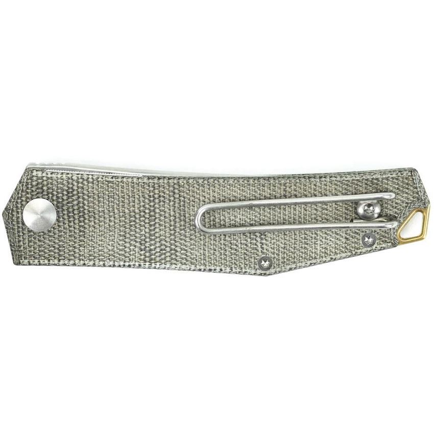 Model/Item/Part Number - GM10258. Giant Mouse Knives - ACE Clyde Stonewash Linerlock Knife Green Micarta Handles. 4" (10.16cm) closed. 3" (7.62cm) stonewash finish Elmax steel blade. Green canvas micarta handle. Lanyard hole. Pocket clip. Thumb stud. Brass accents. Boxed. Made in Italy.